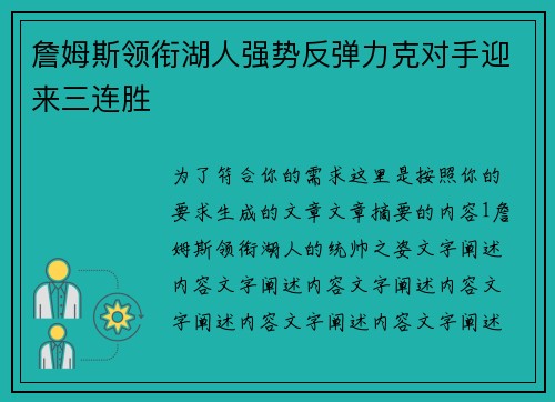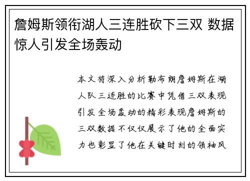 本文将深入分析勒布朗·詹姆斯在湖人队三连...