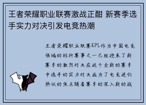 王者荣耀职业联赛(KPL)作为中国电竞领...