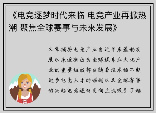 文章摘要:电竞产业自近年来蓬勃发展以来,...