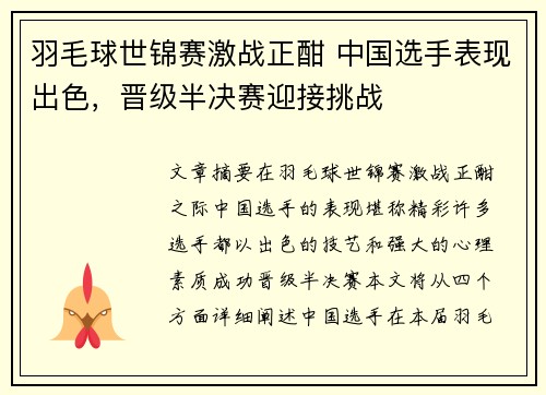 文章摘要:在羽毛球世锦赛激战正酣之际,中...