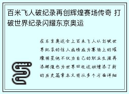 在东京奥运会上,百米飞人以打破世界纪录的...