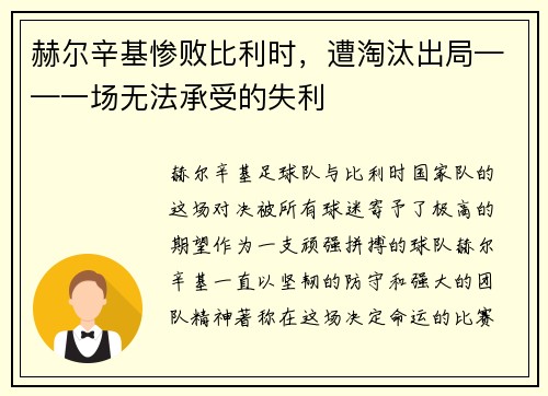 赫尔辛基足球队与比利时国家队的这场对决,...